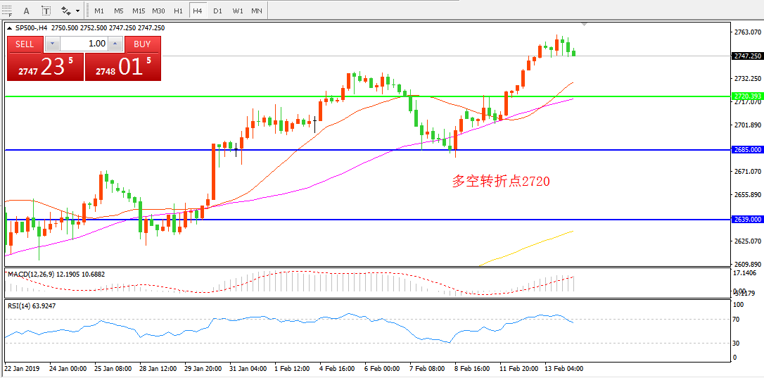 4小时图看,SP500逐渐站稳55周期均线,但短期均线下穿形成死叉。MACD红柱缩短,重点关注下方均线支撑。