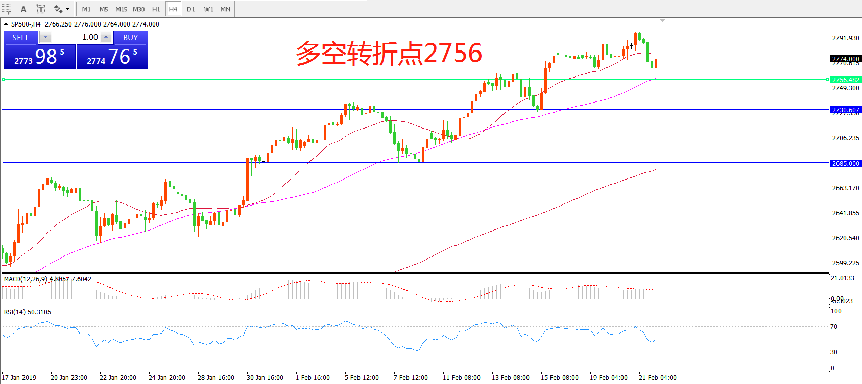 4小时图看,SP500呈现高位震荡形态,昨日下行跌破21均线支撑,MACD红柱减少,但RSI指标拐头向上,重点关注下方2756一线支撑。