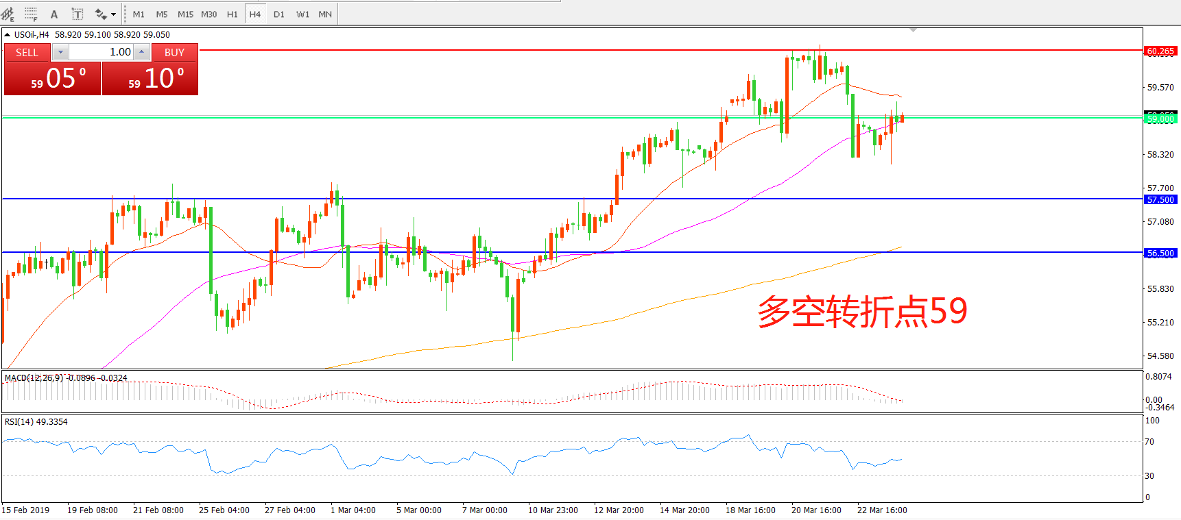 交易策略:在59.00   之下看跌,目标57.50     56.50