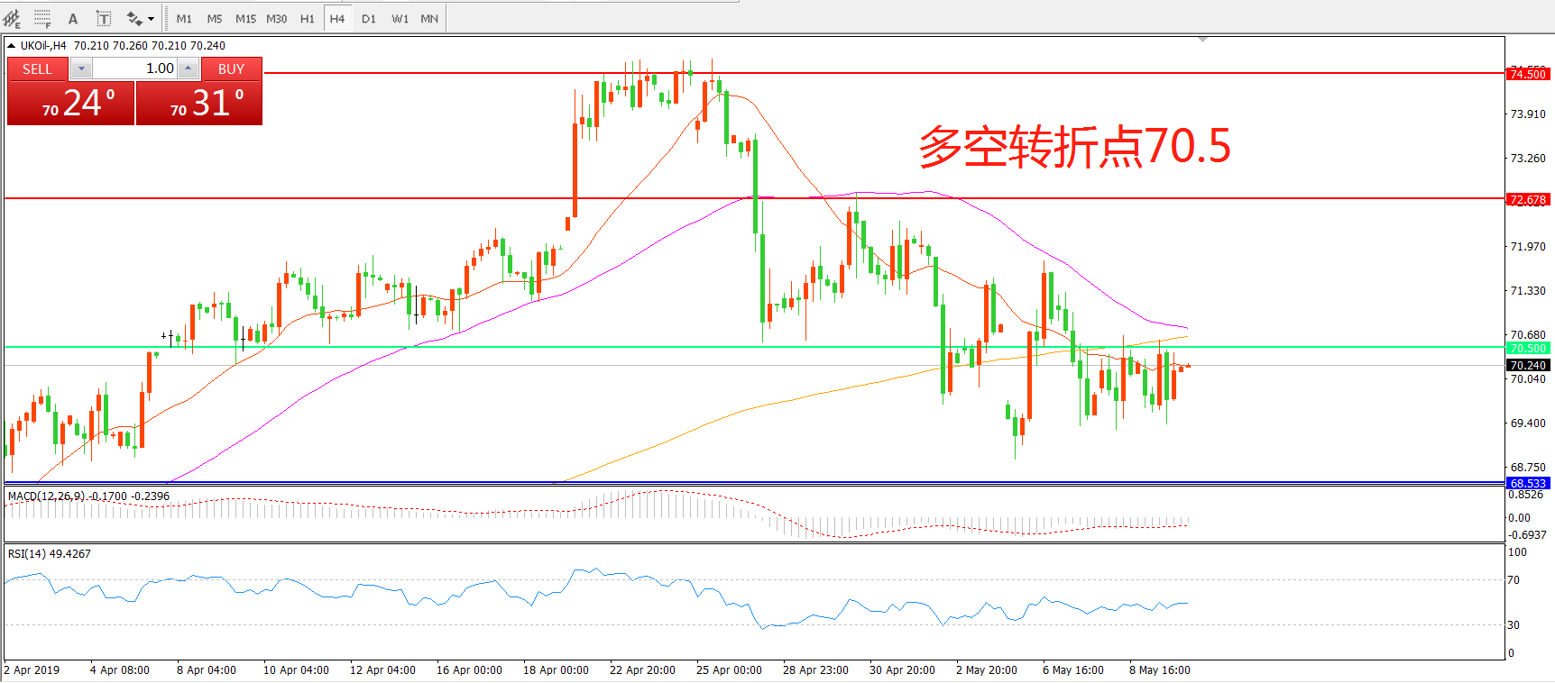 周四,商务部新闻发言人高峰今日表示,刘鹤副总理率团赴美参加新一轮高级别磋商,展现了中方负责任的态度和推动磋商的诚意,希望美方与中方相向而行,照顾彼此关切,通过合作和协商的办法,解决存在的问题。同时,中方已经做好应对各种可能的准备。隔夜,美国美国贸易代表办公室在联邦公报草案中证实,当地时间周五(5月10日)零时零一分起2000亿美元自中国进口商品的关税税率将从10%上调至25% ,中美贸易磋商依然牵动着市场神经,这令原油等风险资产整体承压, 布伦特原油小幅上涨,收报70.30美元/桶。