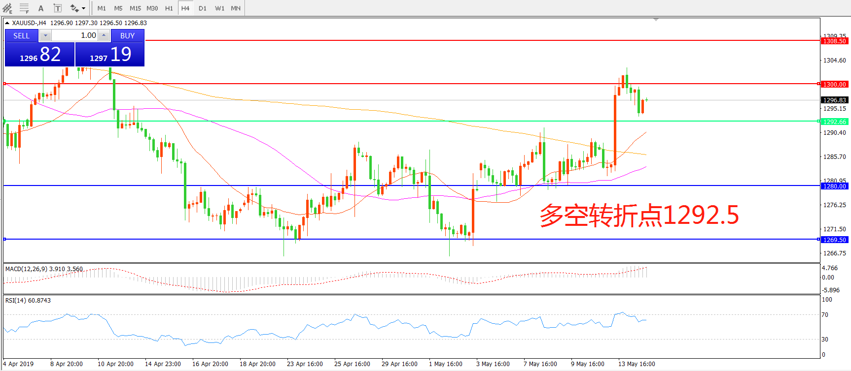 近期受避险情绪变化的影响,黄金价格维持在1300关口附近拉锯,日内CBOE恐慌指数VIX跌幅跌超14%,暂报17.67,因市场逐渐消化中美贸易谈判,现货黄金周一(5月13日)小幅回落,收报1296.92美元/盎司,当然,除了中美贸易事件之外,黄金投资者也对美伊关系恶化持续关注,周一时段沙特阿拉伯表示其两艘邮轮在波斯湾阿联酋水域遭遇袭击,就在沙特声明之后不久伊朗同时呼吁对此事予以更多披露。只要特朗普持续四处“点火”,黄金仍会受到避险情绪的有力支撑。