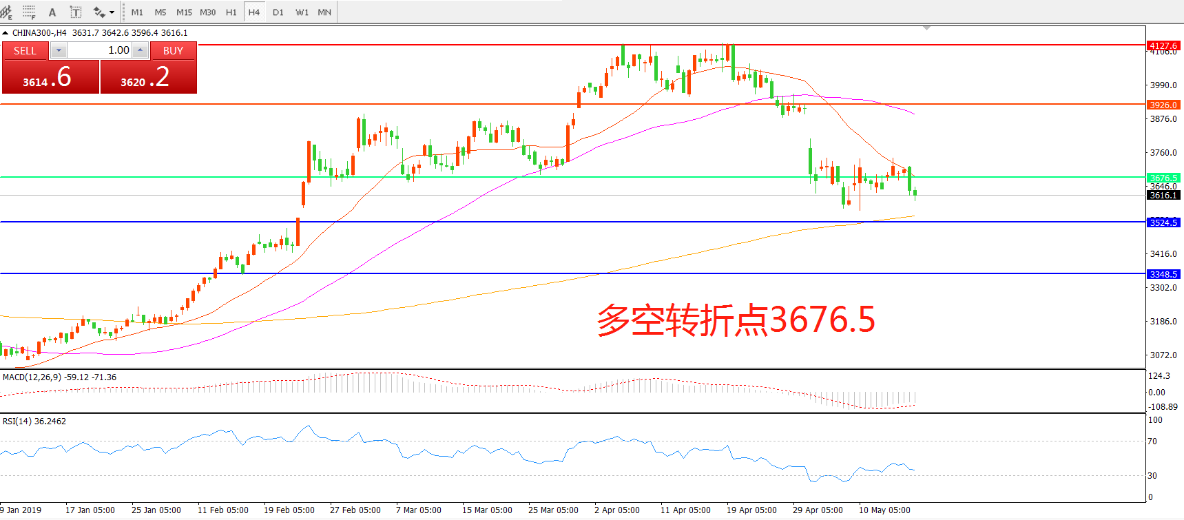 4小时图看,沪深300指数在3676.5附近整理后再次长阴下行, 短期走势偏空,200均线逐渐上行成为下方支撑,MACD绿柱缩短,RSI指标拐头向下,日内以震荡下行思路对待。
