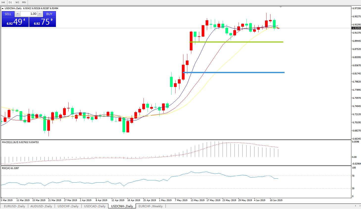 技术面简析:日线图均线粘合呈宽幅整理态势,MACD在0轴上方运行但动能柱轻微缩量,RSI超买区域拐头下行,汇价强力上攻后宽幅整理,预计短期汇价有整理回落需求,中期重点关注中美贸易争端后续进展。