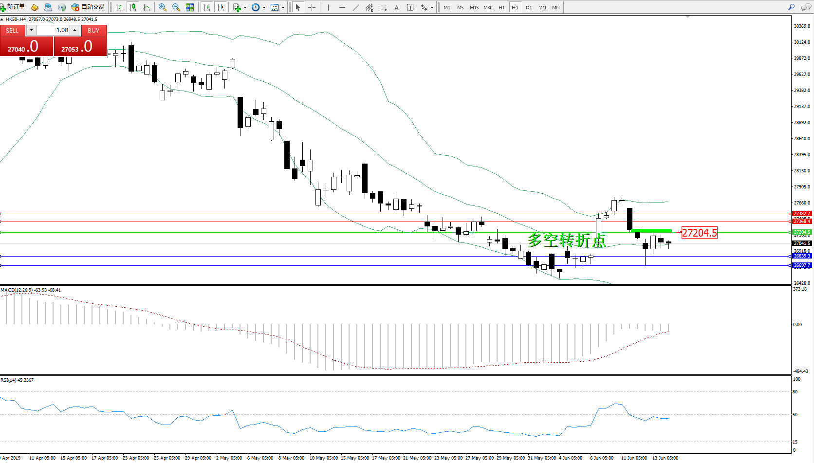 香港恒生指数614日(周五)收盘下跌176.36点,跌幅0.65%,报27118.35点;港股未有跟随外围造好,低开113点,再扩大跌幅,最多跌199点,恒指低见27095,再次迫近27000关口。内地中证监,在陆家嘴论坛上主持上海证券交易所内之创科板开板仪式。并表示两个月后,首批企业将会上市。中证监同时公布多项对外开放措施,包括修订合格境外机构或投资者。以进一步放宽,更容易地参与国内金融市场。