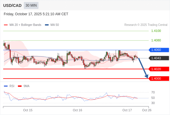 在 1.4060 之下,看跌,目标价位为 1.4020 ,然后为 1.4000 。