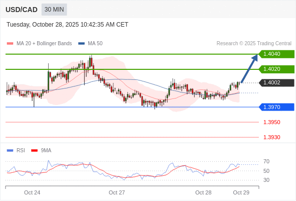 在 1.3970 之上,看涨,目标价位为 1.4020 ,然后为 1.4040 。
