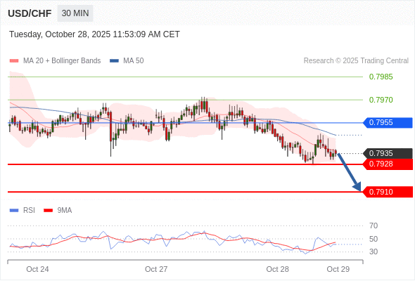 在 0.7955 之下,看跌,目标价位为 0.7928 ,然后为 0.7910 。