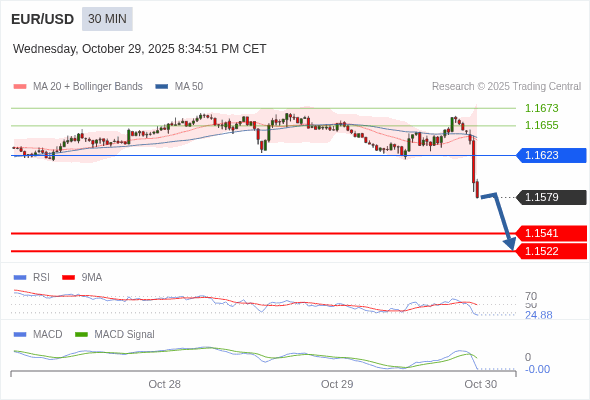 技术点评: RSI技术指标小于30。在这种情况下,说明有很强的下跌趋势,或者意味着处在超卖的状态下,可能会有向上的反弹。我们将观察RSI技术指标是否出现背离现象。 MACD技术指标处在其信号线之下看空。 配置为负。 此外,价位低于其20天及50天移动平均线 ( 分别位于1.1640 和1.1642 )。 最后,价位跌破其布林线通道下轨 (位于1.1599。