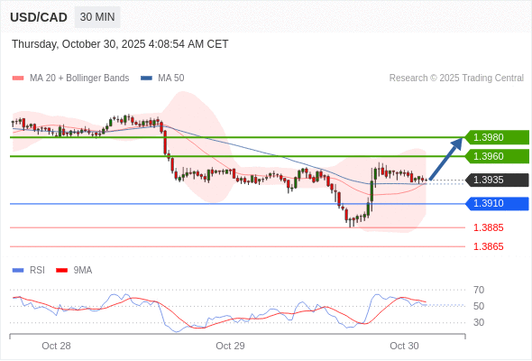 在 1.3910 之上,看涨,目标价位为 1.3960 ,然后为 1.3980 。