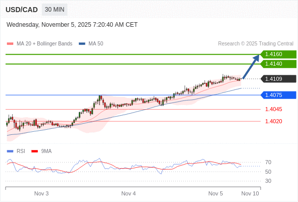 在 1.4075 之上,看涨,目标价位为 1.4140 ,然后为 1.4160 。