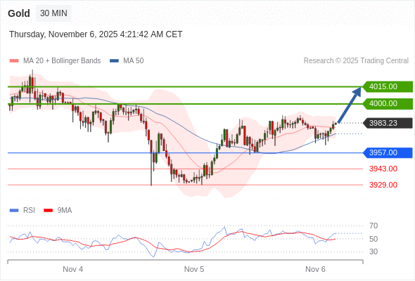 在 3957.00 之上,看涨,目标价位为 4000.00 ,然后为 4015.00 。