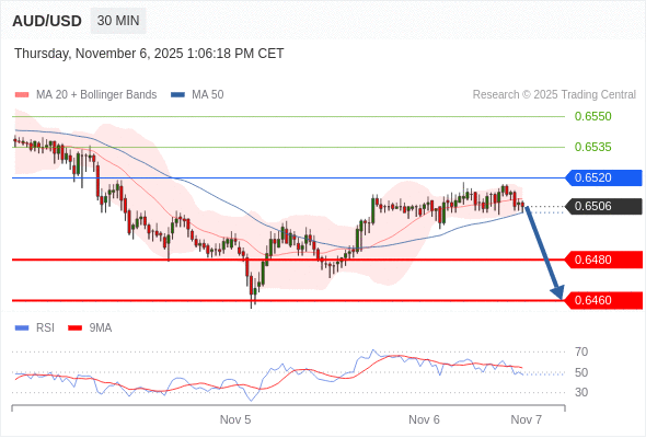 在 0.6520 之下,看跌,目标价位为 0.6480 ,然后为 0.6460 。