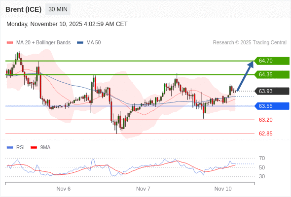 在 63.55 之上,看涨,目标价位为 64.35 ,然后为 64.70 。