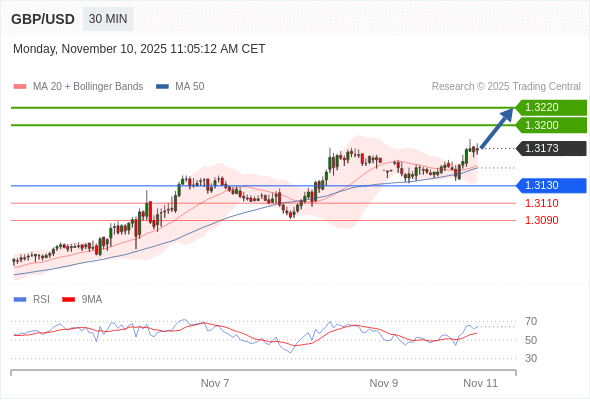 在 1.3115 之上,看涨,目标价位为 1.3200 ,然后为 1.3220 。