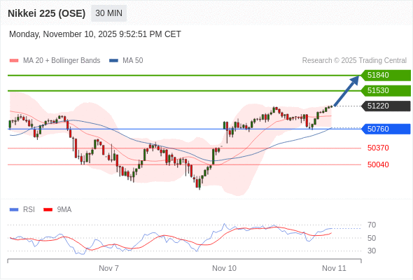 在 50760 之上,看涨,目标价位为 51530 ,然后为 51840 。