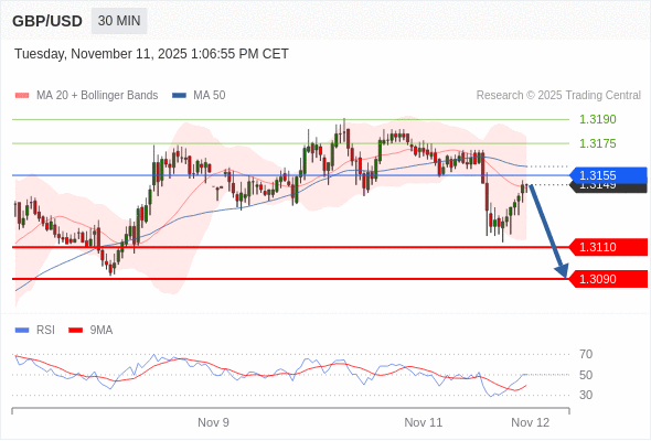 在 1.3155 之下,看跌,目标价位为 1.3110 ,然后为 1.3090 。