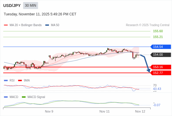 美元/日元 当日内 : 看跌,在 154.54 之下。