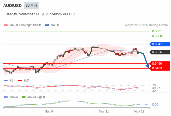 澳元/美元 当日内 : 当 0.6547 维持阻力位时,存在回归 0.6483 的风险。