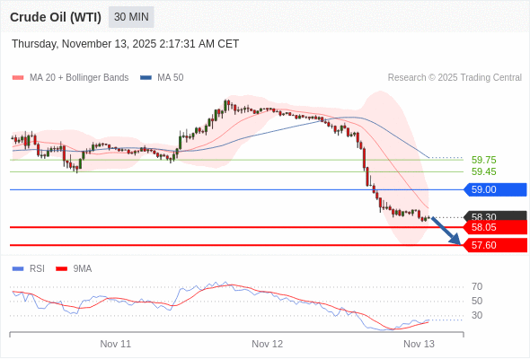 在 59.00 之下,看跌,目标价位为 58.05 ,然后为 57.60 。