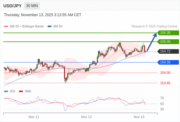 在 154.35 之上,看涨,目标价位为 155.05 ,然后为 155.35 。