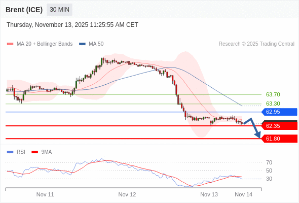 在 63.30 之下,看跌,目标价位为 62.35 ,然后为 61.80 。