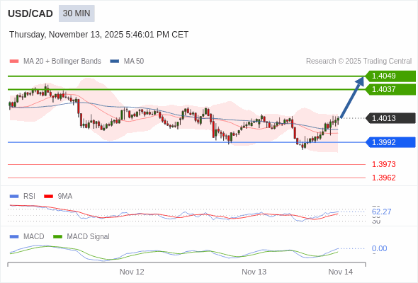 美元/加元 当日内 : 看涨,当 1.3992 为支撑位。
