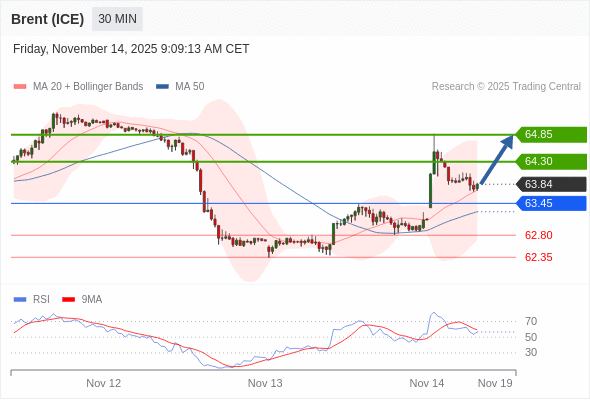 在 63.45 之上,看涨,目标价位为 64.30 ,然后为 64.85 。