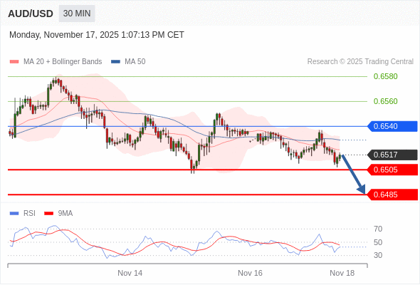 在 0.6540 之下,看跌,目标价位为 0.6505 ,然后为 0.6485 。