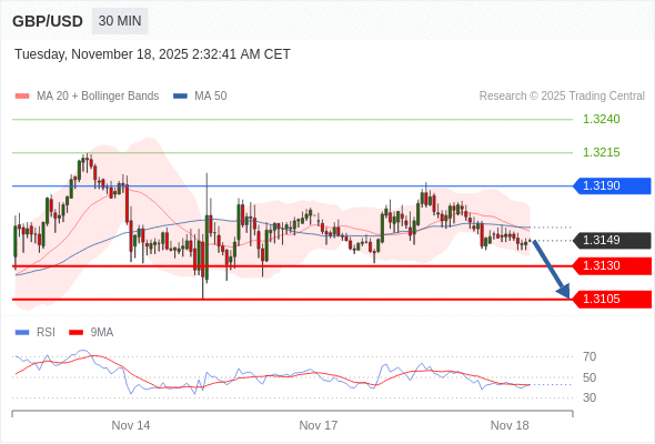 在 1.3190 之下,看跌,目标价位为 1.3130 ,然后为 1.3105 。