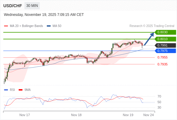 在 0.7975 之上,看涨,目标价位为 0.8010 ,然后为 0.8030 。