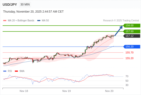 在 156.20 之上,看涨,目标价位为 157.50 ,然后为 158.00 。
