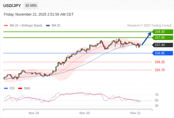 在 156.85 之上,看涨,目标价位为 157.90 ,然后为 158.30 。