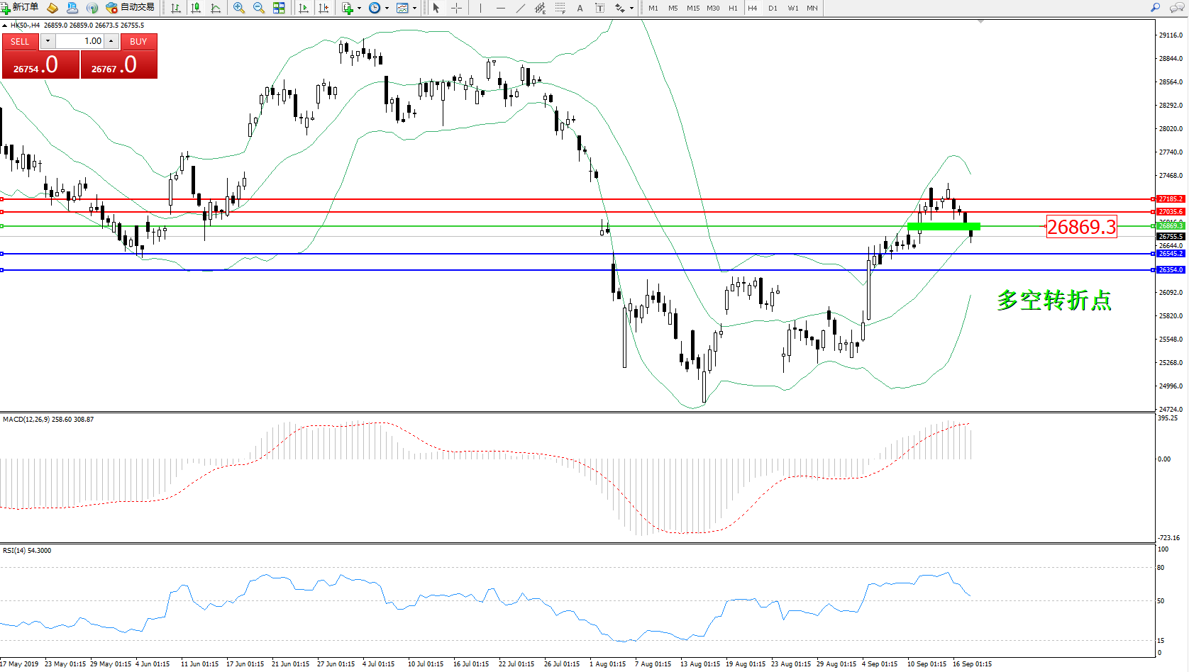 香港恒生指数9月17日(周二)收盘下跌334.31点,跌幅1.23%,报26790.24点。道指结束此前8连涨行情。港股早上跟随外围低开181点,直接跌穿27000关口。随后再扩大跌幅,恒指低见26822,受到外部因素的影响较低。随着市场逐渐消化这一事件的影响,后续走势也将趋稳,接下来的重点在明晚美国联储局公布议息结果。宏观环境向好仍会继续推动股市投资氛围。而且A股昨日跌幅不大,展示出对国际环境变化的良好抗性。此外,中国人民银行降准释放资金对后续股市走势形成支撑,整体投资氛围依然偏向乐观,港股或因此受益。