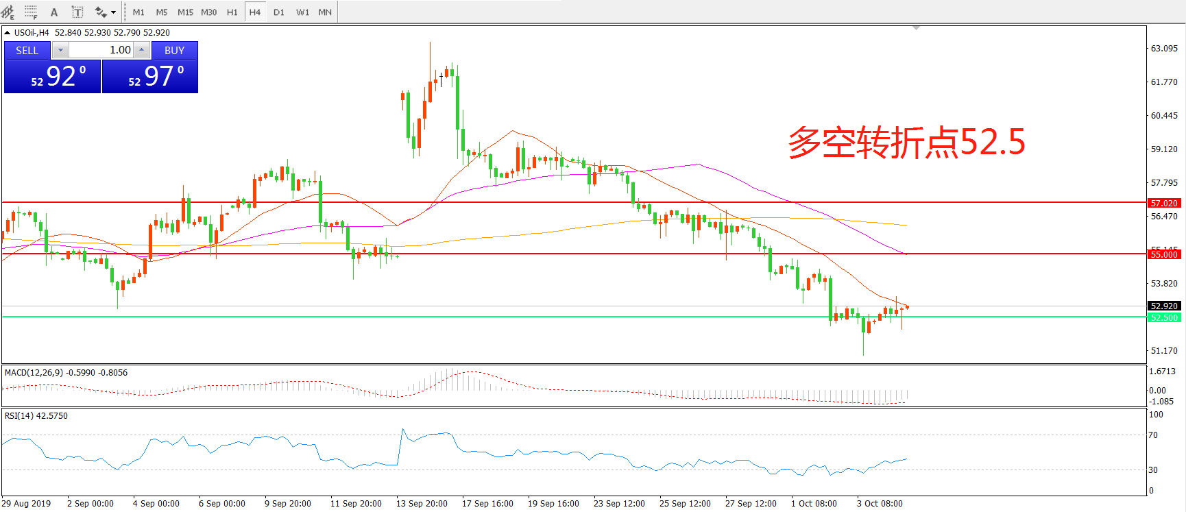 4小时图看,油价震荡下行,整体走势偏弱,52.5成为短期争夺焦点,均线系统拐头向下,MACD绿柱缩短,RSI指标走平,日内延续震荡概率较大。