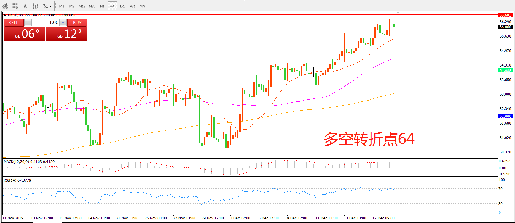 4小时图看,油价连续反弹,整体走势偏强,64美元被突破后,有加速上行的趋势,21均线成为短线支撑,MACD红柱增加,RSI指标走平,日内延续上行概率较大。
