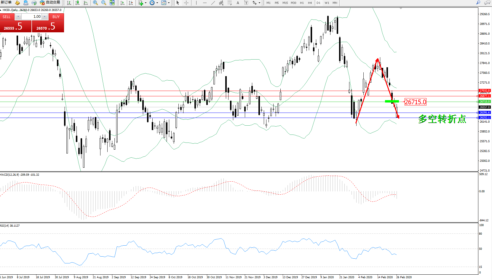 香港恒生指数2月26日(周三)收盘下跌196.74点,跌幅0.73%,报26696.49点;因外围股市大跌影响,今日港股市场集体大幅低开,上午香港推多项积极政策,上午盘主要股指有明显收窄现象。午后受A股大跌影响,又现回落。整体呈现低开回升之势,但表现依旧略显低迷。主板全日成交1195.97亿港元,港股通净流入45.39亿港元。基建股造好,中国交通建设涨2.7%,中国中铁、中国铁建、中国建筑逆势飘红。全球景气周期可能逐步见底,流动性整体仍然宽松,资金流入股市的趋势仍在继续,市场整体估值并不高,港股估值相对更具吸引力。港股短期“逆风前行”,立足中长期逻辑耐心逢低配置。短期做好防御,便宜是硬道理,配置高分红的价值股;立足中长期,精选港股科技股龙头。