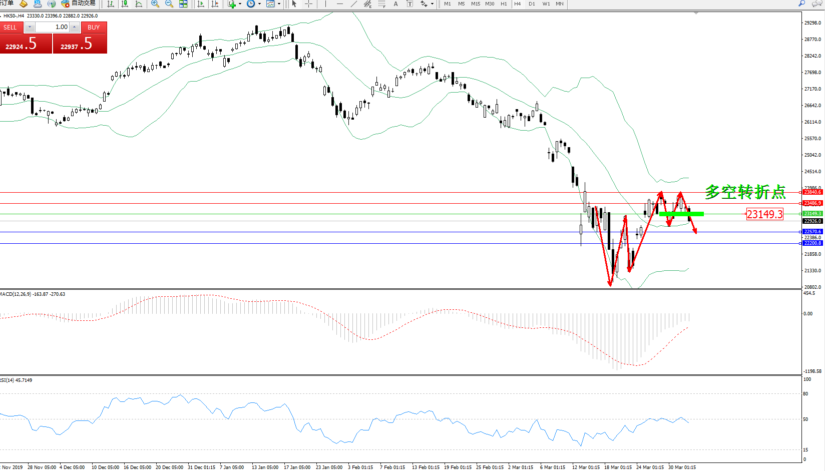 香港恒生指数4月1日(周三)收盘下跌517.69点,跌幅2.19%,报23085.79点;港股市场下跌明显,主要股指盘中均大跌近3%。上午盘弱势震荡,午后受外围市场下跌影响,现单边急跌行情。海外疫情持续严峻,依旧影响金融市场走向,市场信心十分脆弱。新冠肺炎疫情依旧在全球恶化,冲击全球经济,目前累计确诊数据已超86万。全球资本市场正快速走低,美股续挫,道指初步收跌近千点。航空股、在美上市英国银行股跌势惨重。欧洲股指期货也进一步下跌,日本股市收跌4.5%。为应对疫情,英国金融监管部门施压,大银行纷纷停止分红,汇丰也包括在内,道指汇丰控股大跌近10%,拖累恒指跌超200点,主板成交量为1312.3亿港元,港股通净流入40.03亿港元。腾讯、恒生银行、中石化、工商银行等全线下挫;比亚迪股份跌超6%领跌国指。恒生指数有限公司将于2020年5月15日(星期五)宣布2020年第一季度之恒生指数系列检讨结果。恒生指数系列的成份股变动将于2020年6月8日(星期一)生效。