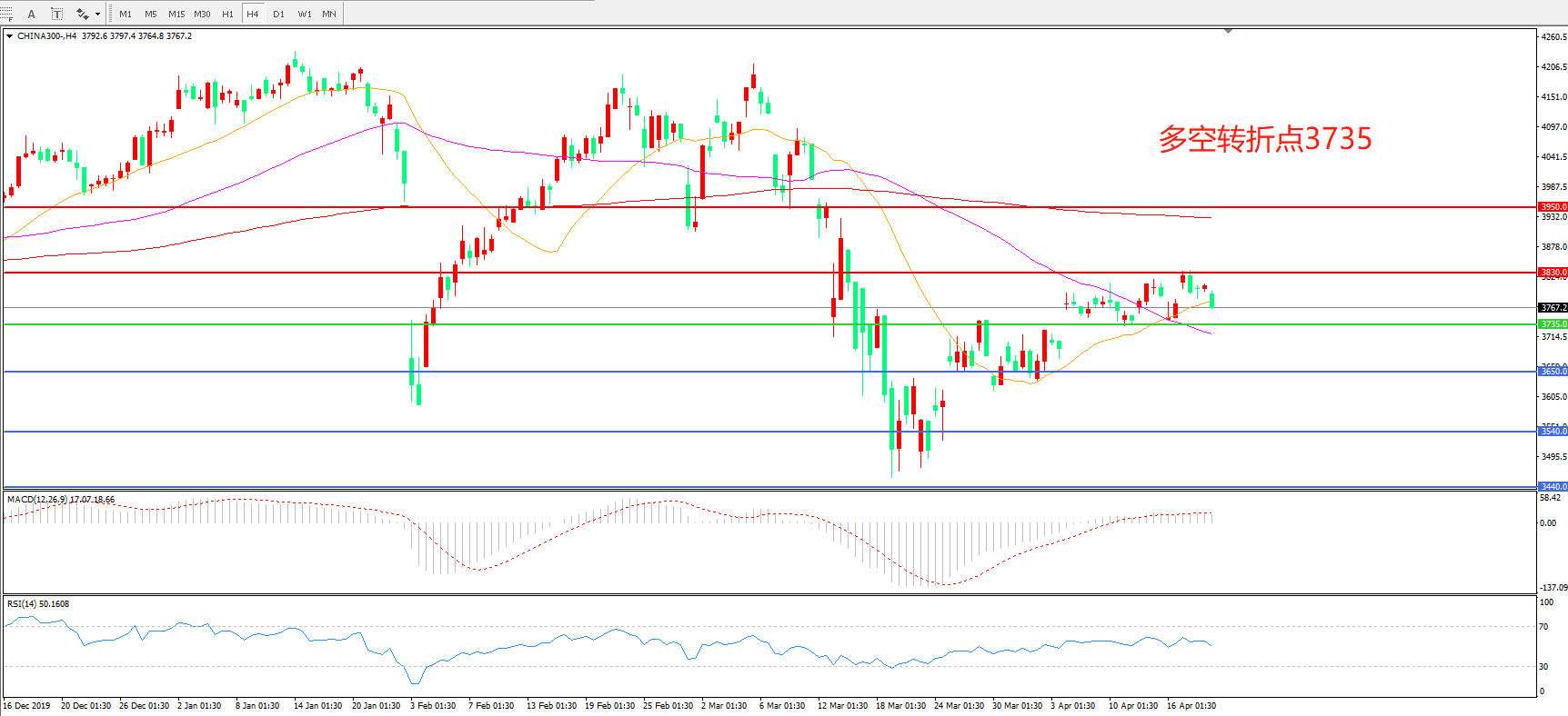 4小时图看,沪深300延续高位震荡,整体呈现区间震荡形态,均线系统走平,MACD绿增加,RSI指标走平,日内延续震荡概率较大。