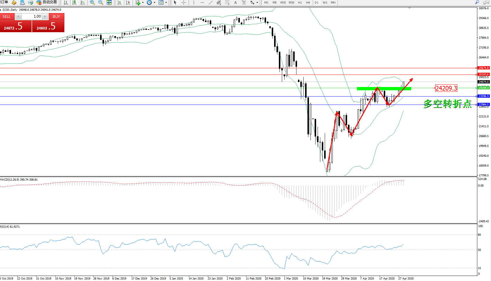 道琼斯指数429日(周三)收盘上涨532.30点,涨幅2.21%,报24633.86点。美国股市升至七周高点,新冠特效药出现希望。推动市场的因素是任何潜在新冠药物和疫苗的正面消息,因为这将是重大转折,再加上有关提前解封的消息,这都会推动市场。美元指数下跌0.45%99.53,美联储宣布政策决定后,该指数触及盘中低点。周三早些时候发布的数据显示,这个全球第一大经济体第一季度国内生产总值(GDP)折合年率萎缩4.8%,为2008年以来最大下滑,也是2014年以来经济首次萎缩。