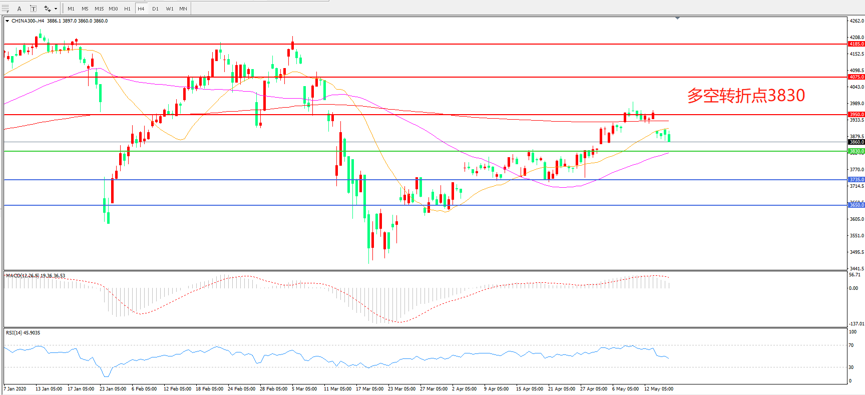 4小时图看,沪深300低开低走,短期升势被破坏,200周期均线再次被跌破, MACD红柱减少,RSI指标走平,日内延续震荡概率较大。