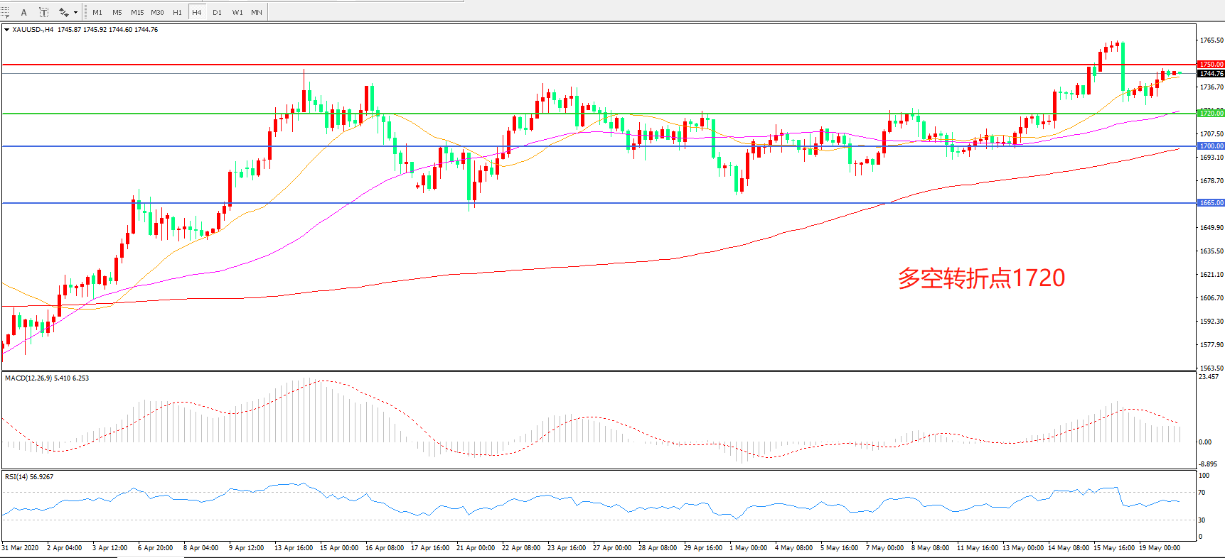 周一(5月19日), 美联储主席鲍威尔在参议院的讲话中飙升美联储已准备好采取更多措施支持美国经济,这一表态令金价得到支撑,金价一度较日低回升逾20美元,最终收报1745.36美元/盎司。此外,对疫苗的乐观情绪消退也提振了金价,据报道,专家质疑Moderna的临床数据,称Moderna没有提供对评估新冠肺炎疫苗至关重要的数据。