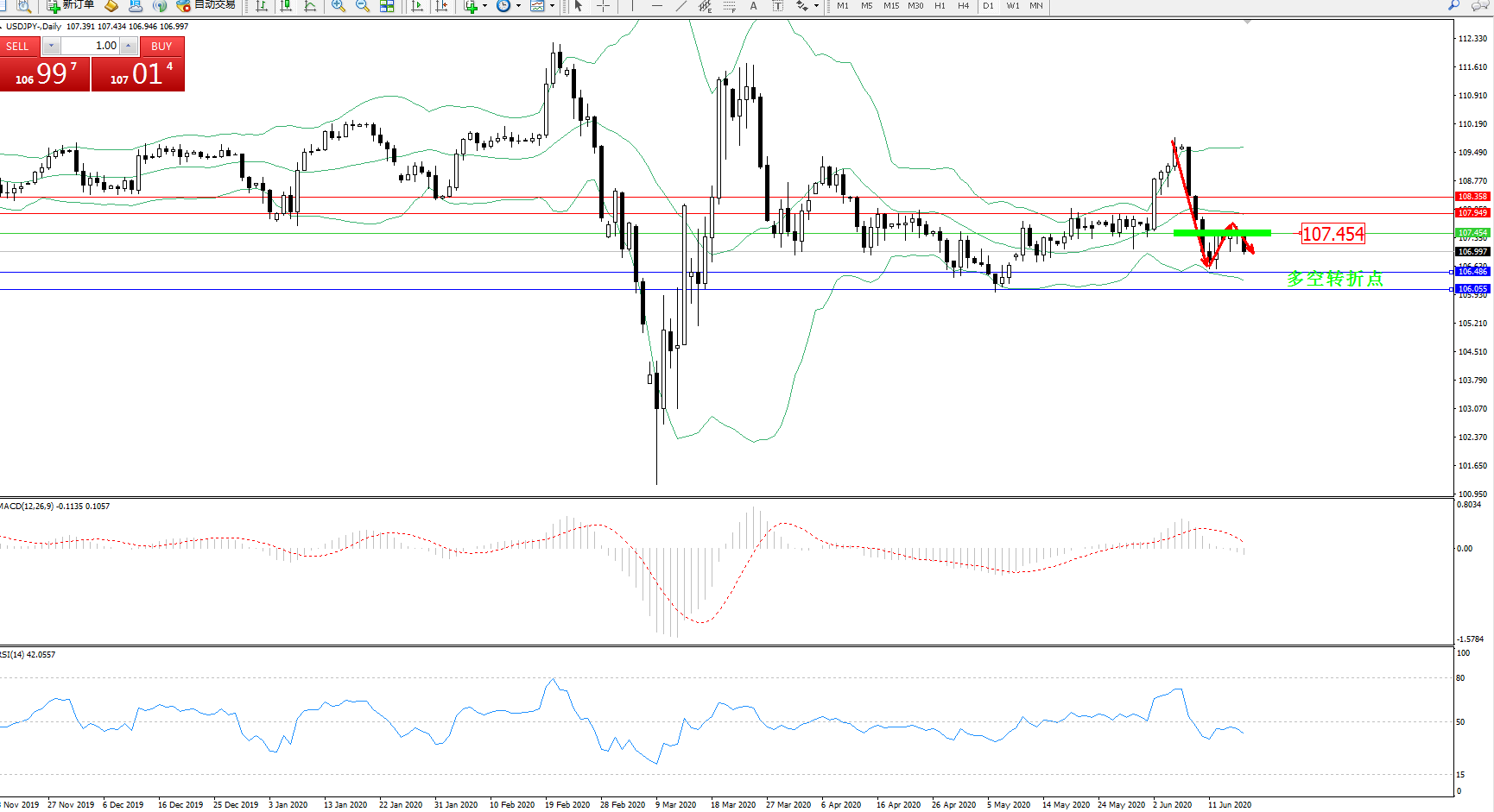 美元兑日元刚刚刺穿107.00关口,最新报106.99,日图跌0.31%,日内市场风险偏好情绪平淡,美元指数走高,非美货币整体承压,投资者依旧押注风险资产反弹,但日本5月出口降幅扩大,在新冠疫情导致贸易下滑之际,对美国的出口下降一半。此外,IMF经济学家表示,全球GDP前景或比预期更糟。在流动性泛滥的背景下,投资者依旧追求高风险高收益,日元并无趋势性行情。