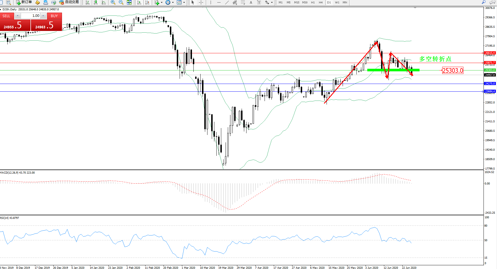 道琼斯指数626日(周五)收盘下跌730.20点,跌幅2.84%,报25015.41点。美股三大指数低开低走集体跌逾2%;美国股市跌至两周多以来的最低水平,新冠疫情的反弹开始为美国经济重启进程按下暂停键。银行股下挫,因美联储限制银行派息规模并禁止回购股票直至9月结束;广告客户的离去使Facebook Inc.创下3月以来最大跌幅,进一步加剧了大盘跌势。佛罗里达州和德克萨斯州是美国新增病例激增的主要地区,周五,这两个州下令再次关闭酒吧,并对餐馆实施更严格的限制,这对在疫情期间开放经济的努力是一个挫败。很明显,市场正经历深度经济滑坡。新型冠状病毒疫情不会被轻易地摆脱掉。