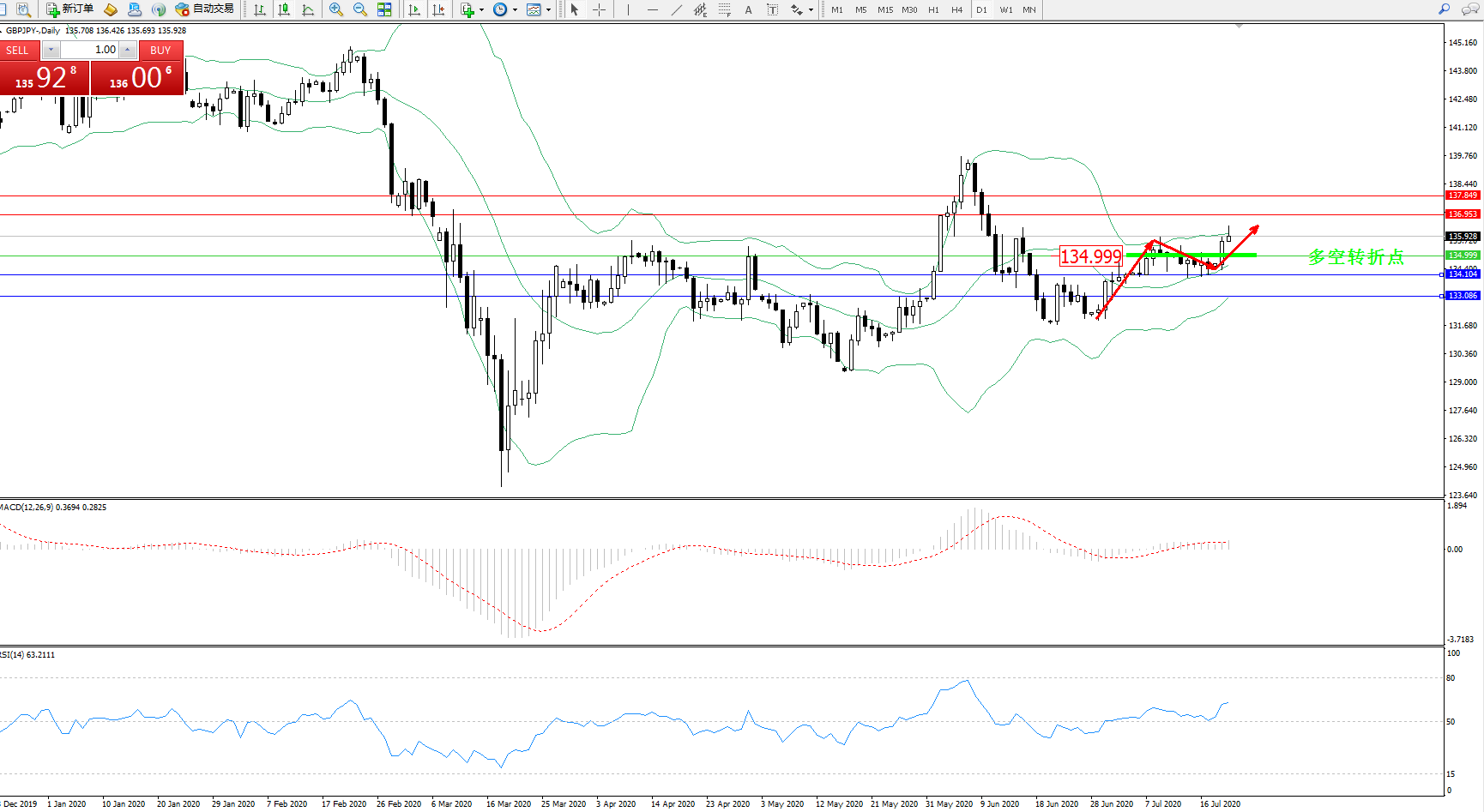 英镑兑日圆拉升至135.932附近整理,英国政府周一出台全面宽松措施,该国医疗及教育工作者将被普遍涨薪,于此同时牛津大学的团队在疫苗研发上取得重大进展,这些消息令英国汇价本周以来持续走强;当前距离英国首相约翰逊所说的7月达成脱欧协议的最后期限还有几天。该报援引政府消息人士的话称,英国政府的假设是无法达成脱欧协议,不过如果欧盟在秋季做出让步,达成"基本"贸易协议还是有可能的。日内欧洲官员对于英国脱欧谈判前景还发表了谨慎乐观的看法,认为10月达成协议“需要努力”,但仍是有可能,这或多或少也平抑了投资者此前在此问题上的诸多顾虑。