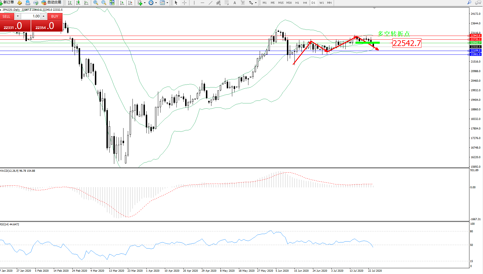 日经225指数7月22日(周三)收盘下跌119.22点,跌幅0.52%,报22765.00点。尽管全球贸易摩擦风波再起,但经济复苏似乎依旧是大趋势,全球市场在亚洲时段的交易更受到日本休市的影响,因此波动幅度和交投水平进一步受限。市场正开始把目光投向下周的美联储政策决议,美元下跌和美股坚挺为疲软需求打击的市场提供了支撑。美国基本面出现一些突然而戏剧性的改善将使人们对美联储货币刺激计划迅速反转的预期成为现实,但目前仍不太可能;基本预期仍然是,风险资产没有得到明显修正,由于美联储货币政策立场以及美日债券收益率溢价几乎被完全消化。