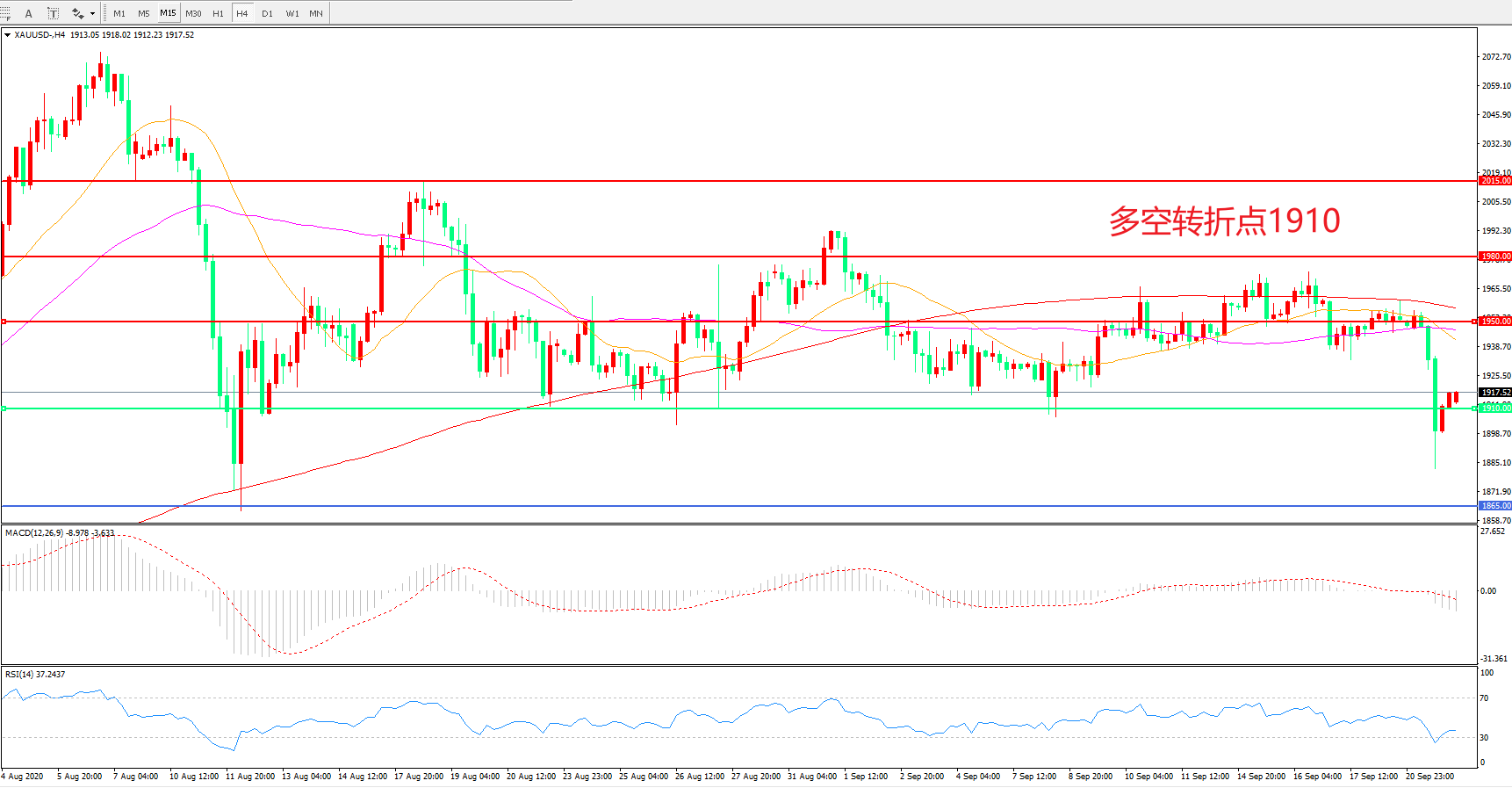 周一(9月21日),受新冠疫情第二波冲击影响,全球金融市场遭遇“黑色星期一”, 欧股遭遇三个月以来最大抛售,美股持续杀跌,恐慌指数飙升....整个市场只有美元开始走强。现货黄金受此影响,一度暴跌至1885美元后小幅反弹,收报1913.60美元/盎司。