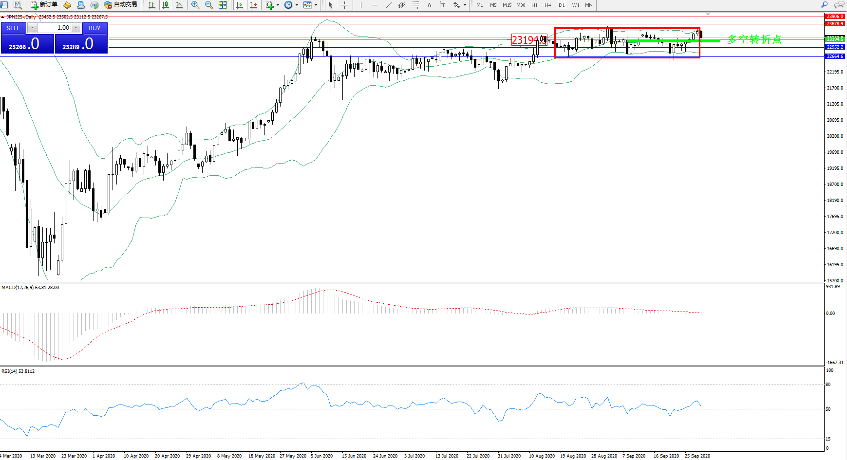 日经225指数9月30日(周三)收盘下跌372.60点,跌幅1.58%,报23166.50点。美国大选首场电视辩论在混乱中落下帷幕,双方都未能对政策前景给出令人信服的承诺,投资者却更加担心选举投票及开票过程可能出现更多不确定性;双方候选人都拒绝承诺会在计票初步揭晓城市体面认输,这令全球投资者担心大选投票日过后可能出现僵局,并引发政治、社会、经济各领域的全面混乱。预期令美股股指期货在辩论结束后急转直下,并带动其他风险资产也遭遇抛售浪潮,日本内阁官房长官加藤胜信:正安排菅义伟和蓬佩奥在下个月的会面。当前的工业生产水平依然严峻。若有需要,将出台及时的经济措施。后市市场目标将转向美国的就业数据影响,本周五这份美国大选前最后的非农就业数据将对市场情绪带来更大的影响。