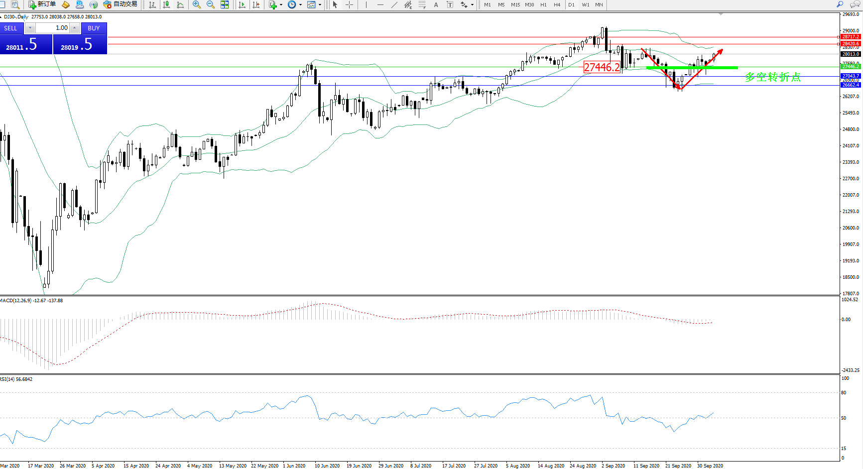 道琼斯指数10月5日(周一)收盘上涨465.80点,涨幅1.68%,报28148.64点。美股三大指数全线收高,美国股市收于日内最高点,特朗普将出院以及国会推进刺激案谈判的消息激发了市场乐观情绪。财政刺激案谈判仍然充满变数,特朗普的健康状况也存在很大不确定,虽然现在有不少杂音,但有经验的交易员可能会找到做多的机会。美元指数跌0.38%至93.46,跌至9月21日以来最低,因为风险情绪改善和民主党大获全胜的预测推高股市和美国国债收益率。美国总统特朗普的健康状况也是一个因素,因Covid-19检测结果阳性而在周五住院的特朗普说,将在周一傍晚出院;预计市场将保持波动,尤其是在美国大选之前。在新冠病毒大流行期间,仍有可能与美国国会就更多的经济救助达成协议,特朗普总统致力于达成协议,该消息令乐观情绪升温。不过,如果不能达成协议,可能会对美元有利。
