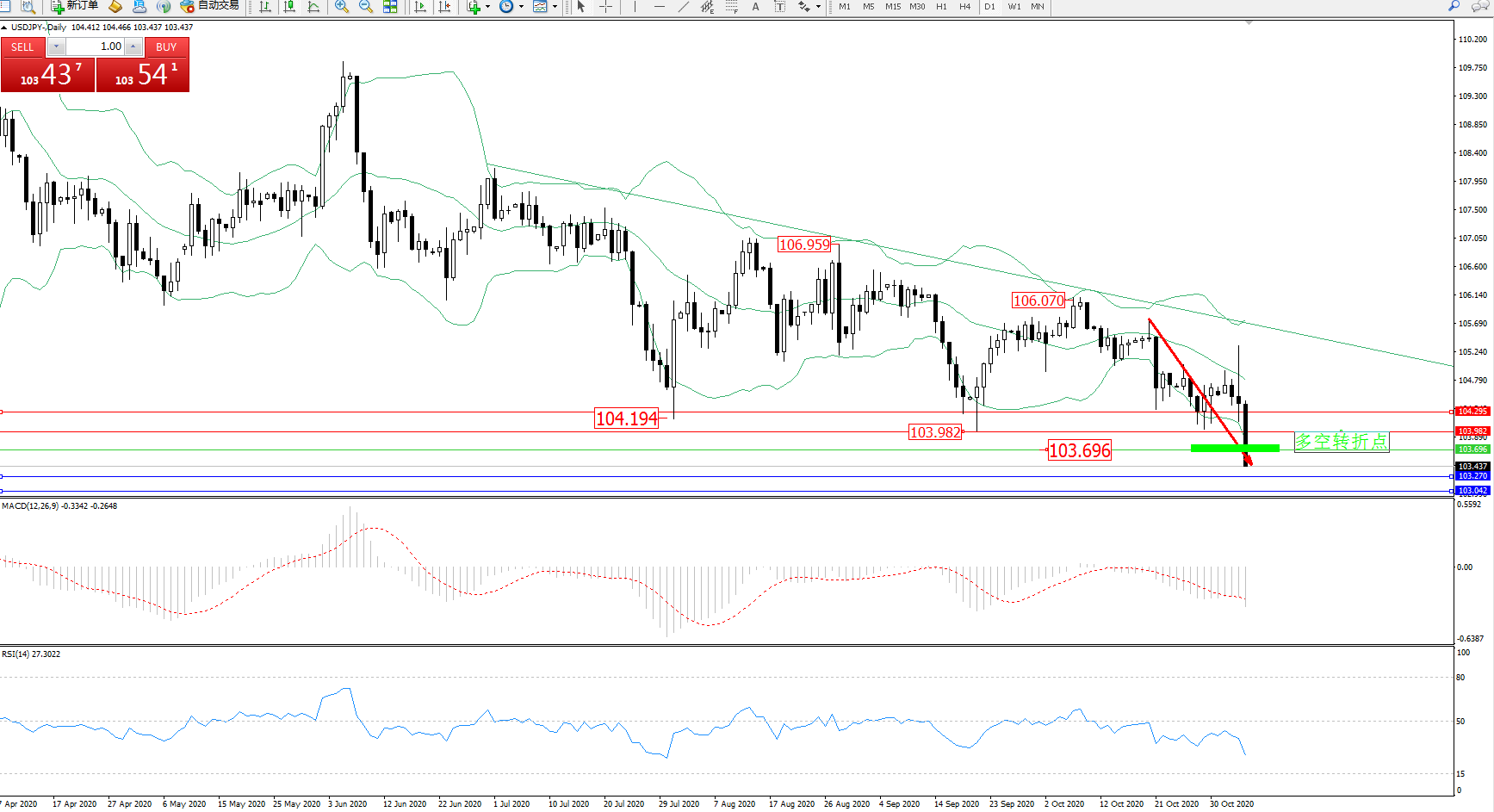 技术点评:空头动力延续布林带指标通道内中下轨区间持续震荡向下移动态势良好,低位跌破下轨附近节点后强势下探,跌破前期低位103.982附近节点,下行态势良好,且空头趋势尚未有最终结束态势,布林带指标呈张口走势持续中,MACD指标处于空头区域维持整理下行中,RSI指标处于空头区域维持整理平移后有继续向下移动态势;