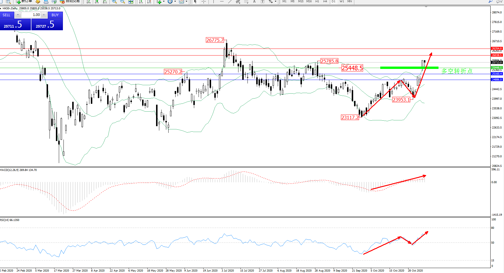 技术点评:多头动力处于布林带指标通道内维持宽幅整理走势,多头动力持续多次发力拉升上扬,突破布林带指标上轨附近节点后再度上扬,前期高位25785位置已然破位,且有继续上扬态势,布林带指标呈收口走势后再度张口持续上升,MACD指标处于0轴线上方维持窄幅整理平移中,RSI指标处于多头区域维持震荡拉升上扬走势持续;
